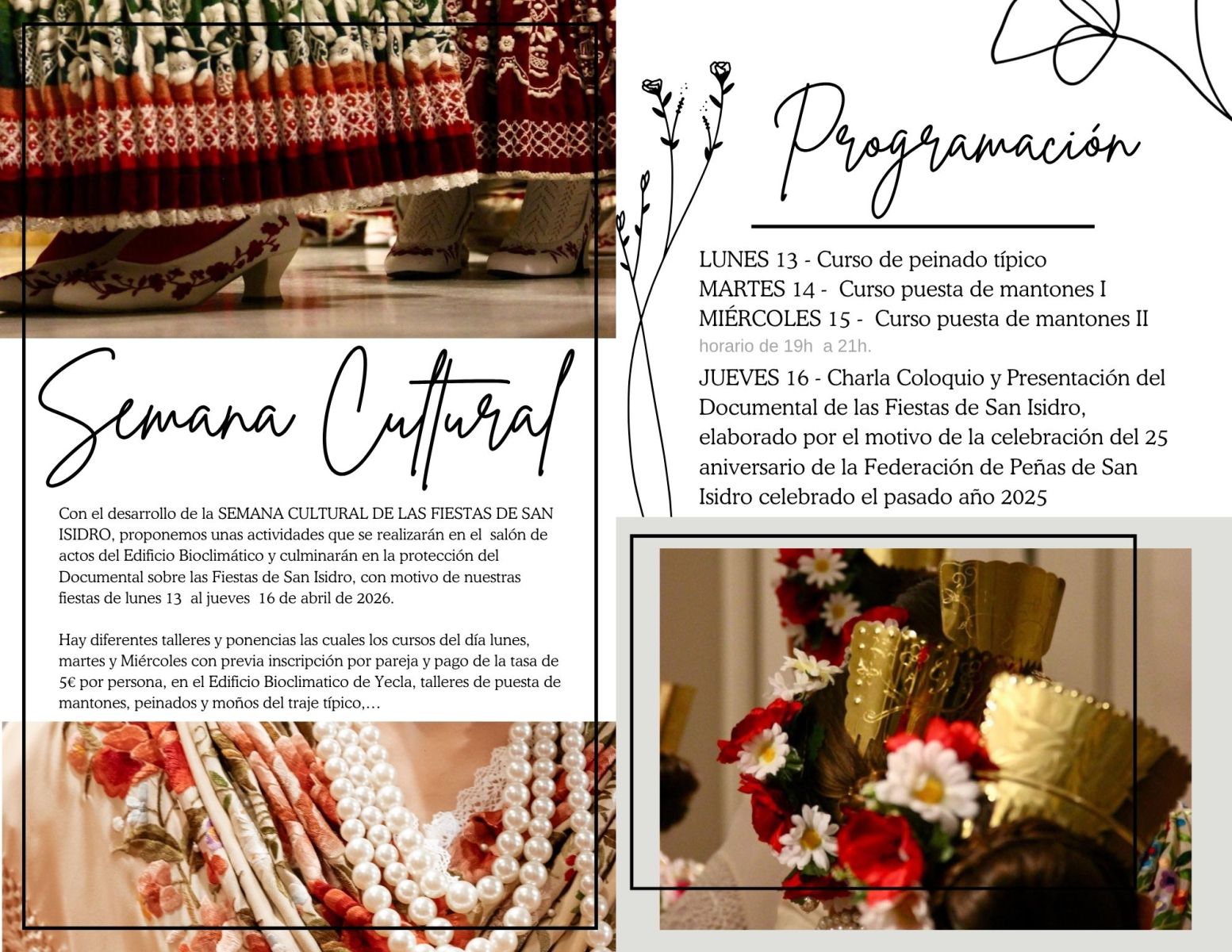Llega la Semana Cultural de las Fiestas de San Isidro 2026 del 13 al 16de Abril de 2026… TALLERES DE MOÑOS Y PUESTA DE MANTONES y el ESTRENO DEL DOCUMENTAL DE LAS FIESTAS DE SAN ISIDRO en el CINE PYA!!! Os esperamos!